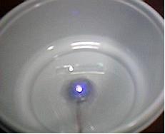 Bugs are attracted to UV LED light. One can try different shapes and types of pans of water. Put a little bit of soap in to cut down surface tension and helps keep the bug in the pan. At right is a low power way of killing bugs and mosquitoes. With power applied, it looks like the photo below.