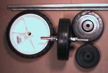 At right is a 3/8" flat washer, lock washer, and two nuts being used on each side of the drive wheel to lock the 3/8" shaft in place on the lawn mower wheel. Lawn mower wheels come with different size holes. Typically 3/8 inch and .5 inch are the most common. If you use a wheel with a .5 inch hole for the shaft then use a short section of .5 inch OD aluminum pipe (Home Depot has it) as a bushing. A 5.5" length of 3/8 inch treaded bolt can be used for the shaft.