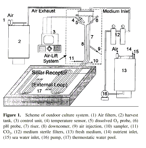 Both photobioreactors are made of Plexiglas with an airlift system to recirculate the fluid and an external loop which acts as solar receiver submerged in a thermostatic pond of water. The walls of the pond were unpolished and painted white to increase the reflection of the solar radiation. The air-lift was made up of a degasser in which the dissolved oxygen, pH, and temperature probes were in-serted, all of them connected to an on-line control unit and a computer for data monitoring and backup (Molina Grima et al., 1994c, 1995).
