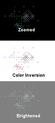 Here is the blue Venus in the five photos, zoomed 600%, brightened, and color inverted to show the dominant colors. Photo 1: