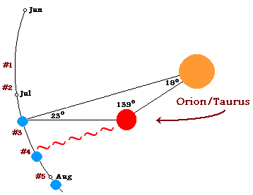 あなたがこの時、地球の軌道面の上から、オリオンに向いて見る時に、地球と太陽と惑星Xは、このように地球での23度、太陽での18度、惑星Xでの139度の三角形を形成する。
