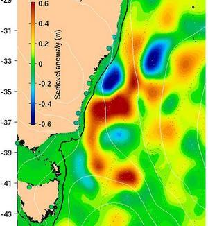 A large cold-water eddy has developed off the coast of Sydney causing the sea surface to fall by almost a metre. The mysterious whirlpool has also caused ocean currents to change course and stretches 200km across and one kilometre down to the ocean floor, CSIRO oceanographers say. Oceanographers say the centre sits 100 km off the coast and could stay there for several months. The eddies cannot be seen with the human eye, but could contribute to cooler beach swimming conditions.