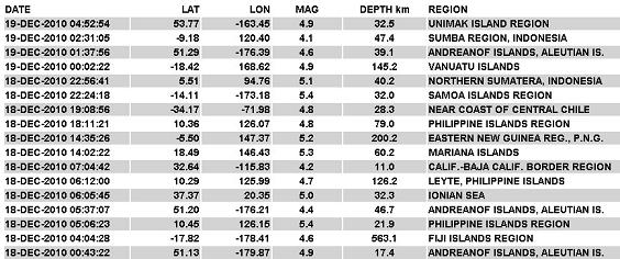 Going into the arrival of the 7 of 10 scenarios predicted to occur before the end of 2010, all looks calm! At least this was the case on December 20, 2010. In fact, half way through December 20, 2010, UTC time, the live seismographs were dead calm except for a bit of magma sloshing. The IRIS chart showed no new quakes over magnitude 4.0. On this IRIS chart, below, all recent quakes are in orange, a day late, not red as same-day quakes are shown. No quakes magnitude 4.0 or greater, had occurred since December 19, a full 13 hour absence.