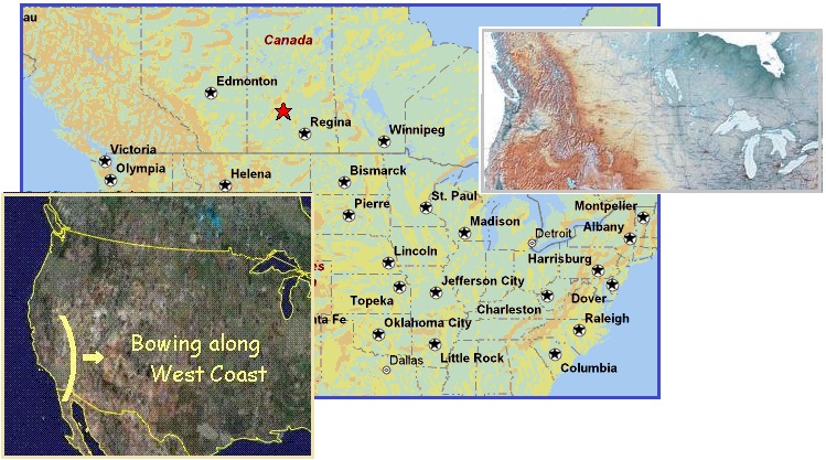 The North American continent is not exempt from these sounds, as the bowing of the North American Plate is like putting the plate on the rack. If the Inquisition tore limbs from arm sockets, the bowing is snapping land along the far side of the bow. The bow pulls the Aleutian Islands toward the tip of Mexico, stretching the swath of lakes across northern and eastern Canada. Saskatoon, Saskatchewan has had repeated bouts of this bellowing, which was featured in the Huffington Post recently.