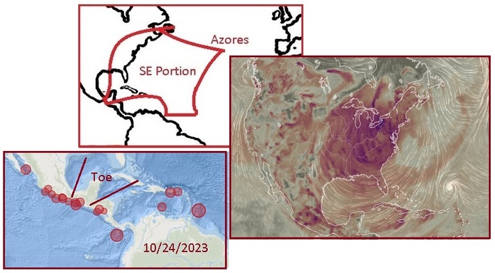 On October 24 we saw action in the Caribbean. While S America was in a waggle, the Caribbean Plate was pulling toward the Pacific to make room for the SE Portion to scrape over the hump in the Caribbean. The Toe is showing continuous quakes as it pulls to the East. Look at the distress in the Mainland near where the New Madrid Fault Line is separating - all the way from NOLA to the Seaway exit!