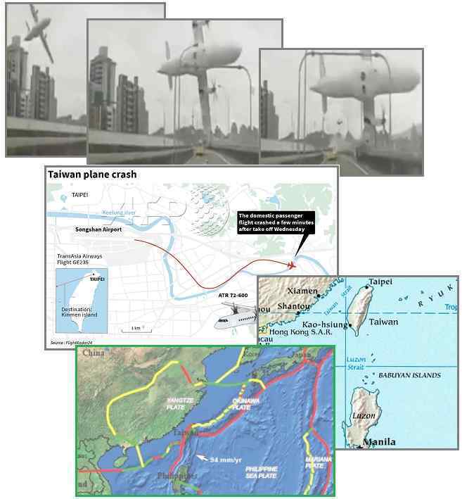 The island of Taiwan is situated in an unfortunate position. The Philippine Plate is tipping - dropping down on the west side, sinking under the island of Taiwan. The Okinawa platelet also touches Taiwan on the northeast. To the west is the Yangtze platelet. Taiwan is thus continually getting squeezed from all sides, just the factor that creates electro-magnetic screech causing the EMP from arching between the charged tail of Planet X, aka Nibiru, and the ground. At least one engine was running during takeoff and then promptly quit. This will again be blamed on airline maintenance or pilot error, as the airlines do not want their profits diminished.