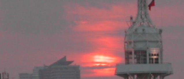 Jan 1 afternoon Sun and sunset from Kobe, Japan. Used CD disc. Makino In a reflection on a building, the setting Sun can be seen as too tall and not broad, which direct photos also show. Nancy